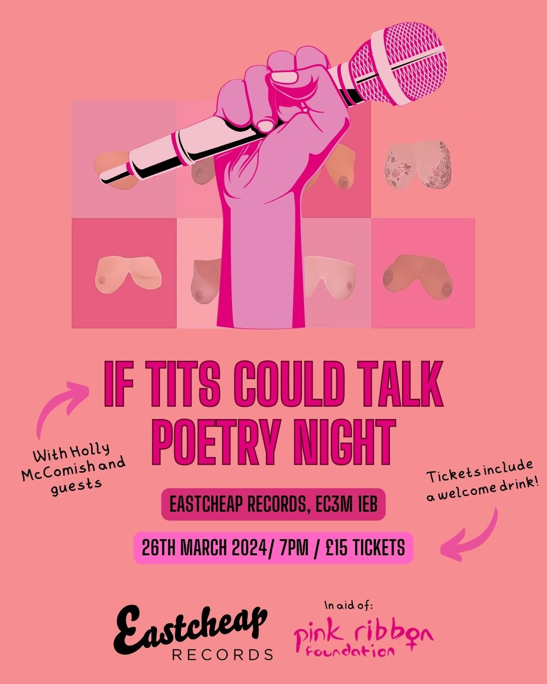 The Pink Ribbon Foundation have championed Holly and her unique and important poetry for many years and is delighted to collaborate once again with her on this second event If Tit's Could Talk event. Once again, this is sure to be a fun and empowering evening.